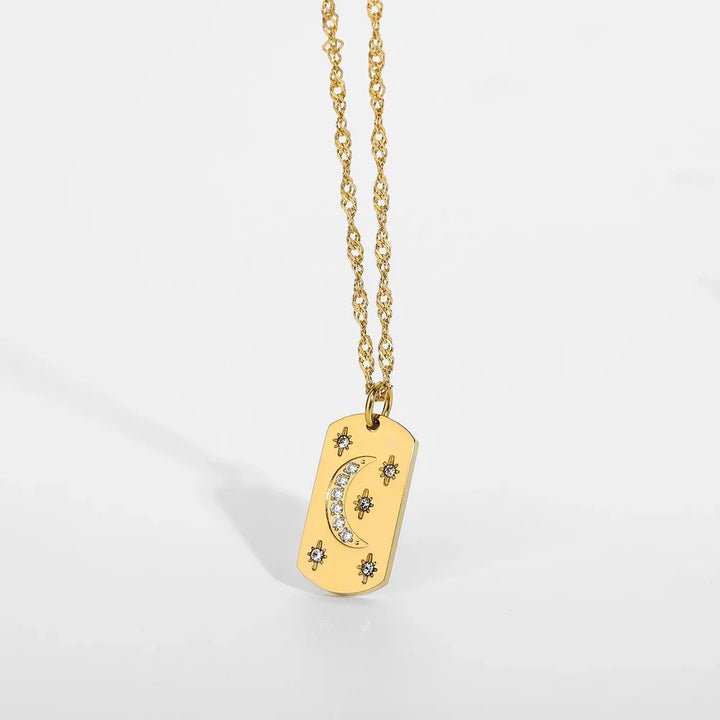Gold dog-tag style pendant with a large crescent moon surrounded by star details, each set with glittering stones. A dreamy piece for celestial lovers.