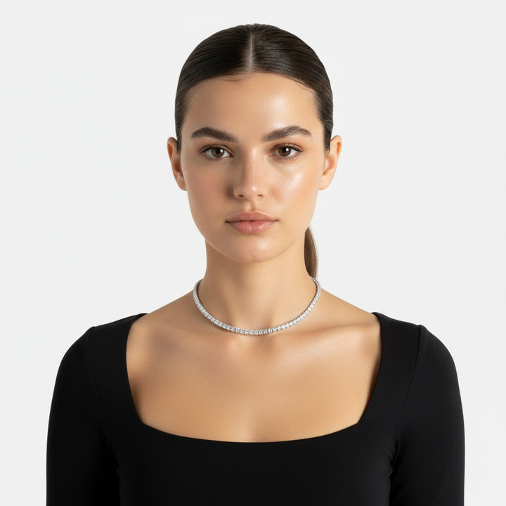 שרשרת Aria משלבת שורה רציפה של אבני מואסנייט VVS בליטוש עגול ומדויק, היוצרות ברק ועומק מרהיבים בכל תנועה.