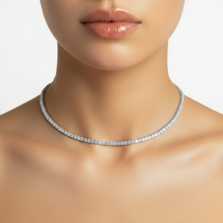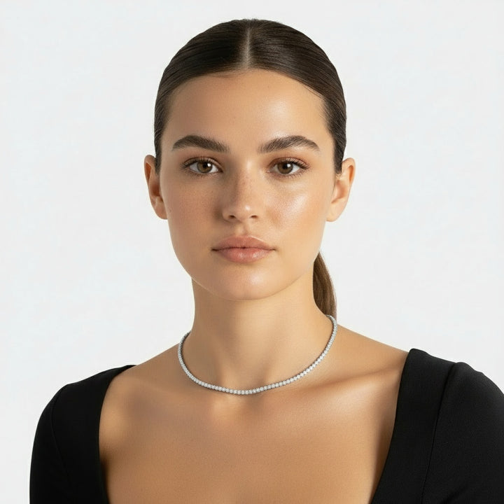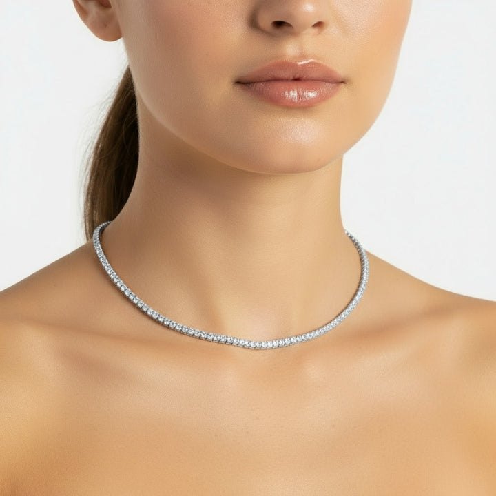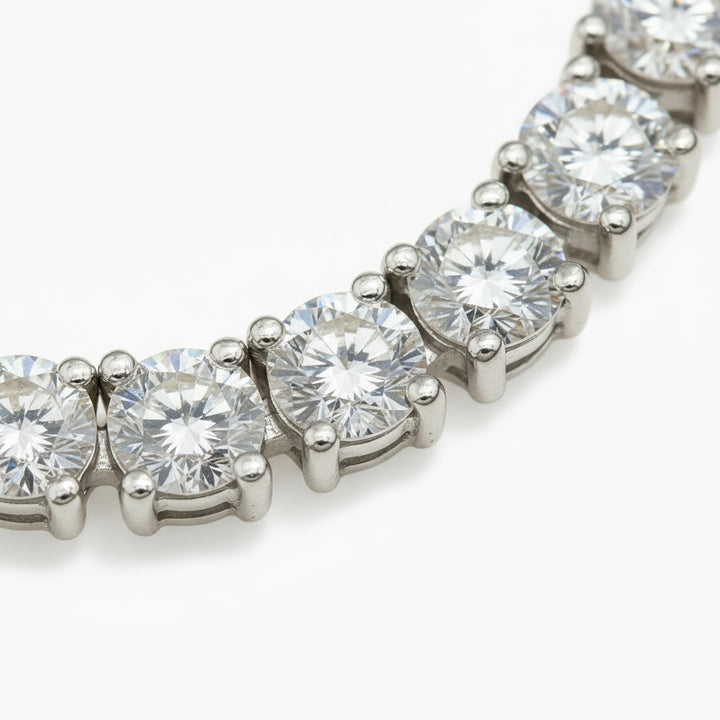שרשרת Aura משלבת שורה עדינה של אבני מואסנייט VVS בקוטר 3 מ"מ, המפזרות אור וברק מרשים בכל תנועה.
