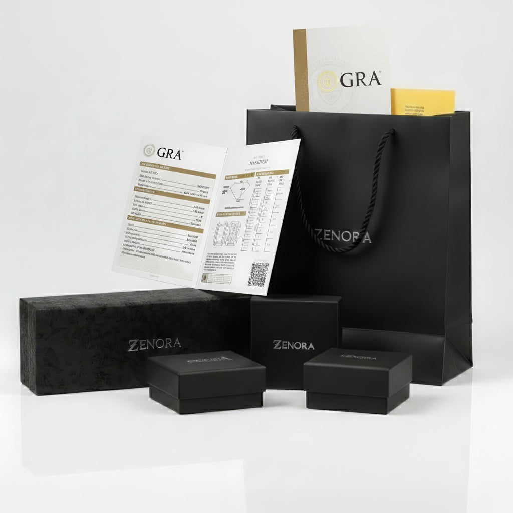 כל תכשיט של זנורה מגיע עם תעודת איכות רשמית מהמכון הבינלאומי לחקר יהלומים GRA ואריזת פרימיום במתנה.