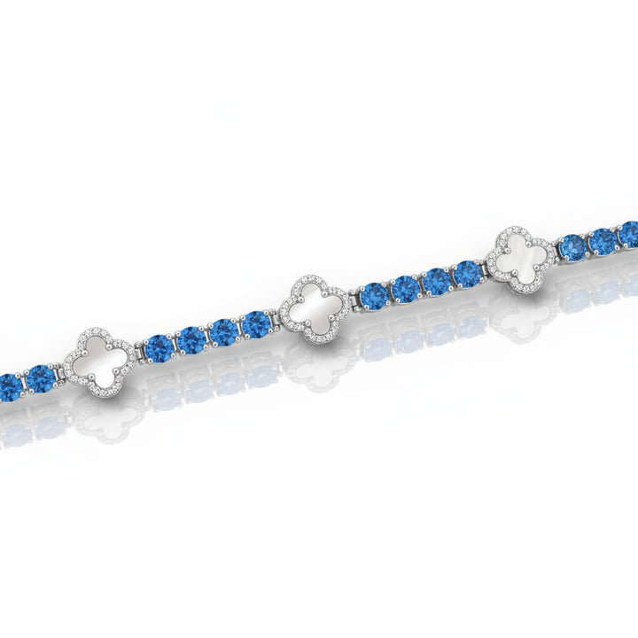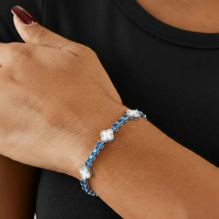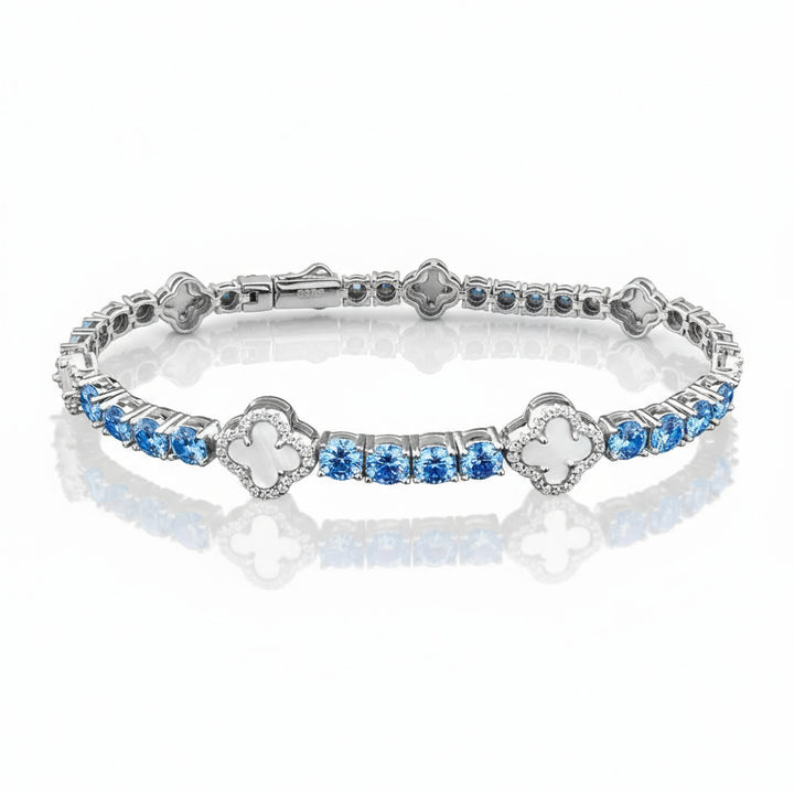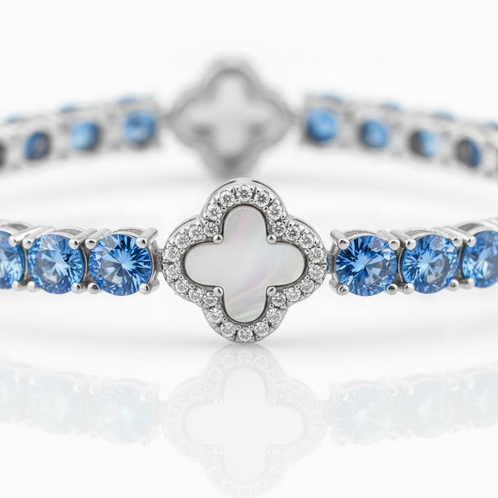 צמיד Clover Azure משלב את הברק של אבני מואסנייט כחולות באיכות VVS D עם תליוני אם הפנינה בעלי מראה רך וזוהר, המסמלים איזון והרמוניה פנימית.