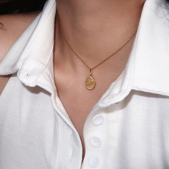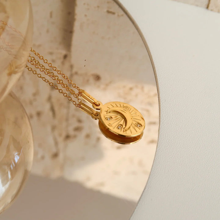 Round gold pendant with a crescent moon and sunburst engraving, embodying the harmony of night and day. Elegant, symbolic, and endlessly wearable.