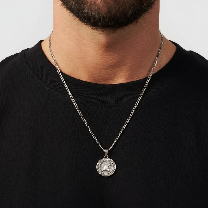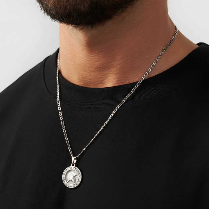 Silver pendant necklace with 'Spartan Warrior' inscription on a white background