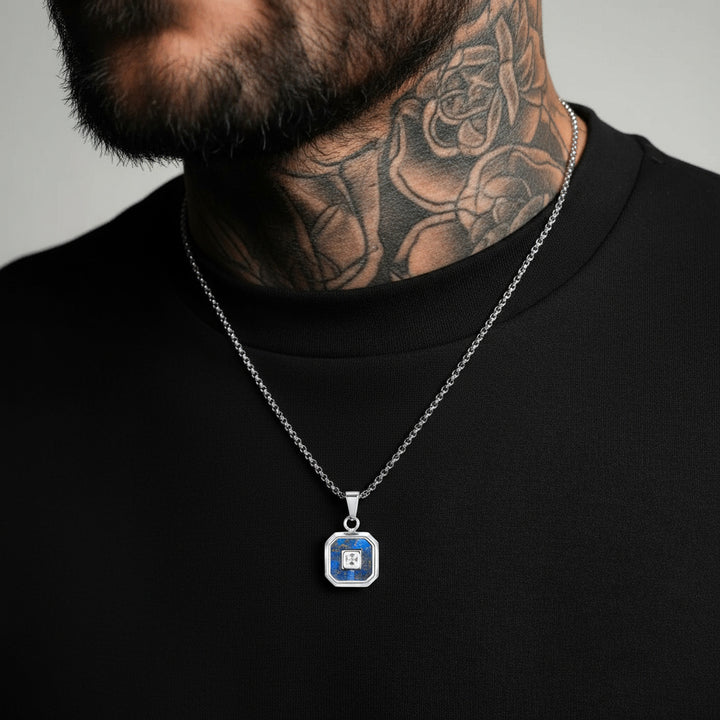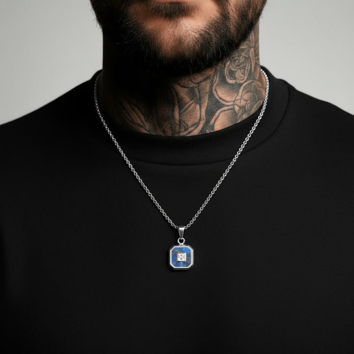 Silver necklace with a blue pendant featuring a central diamond on a white background