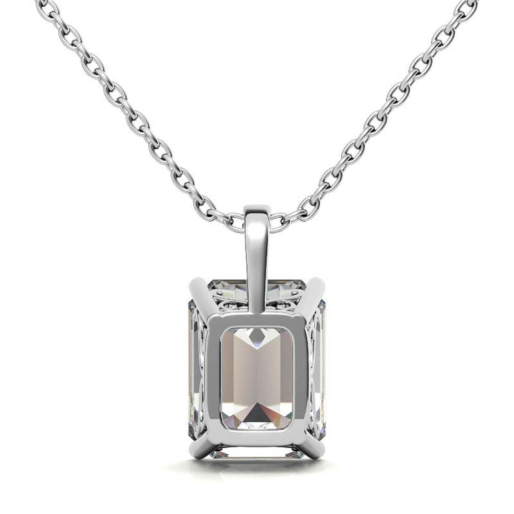 Crafted from solid 925 sterling silver, plated in 14K white gold, and completed with a matching chain, this piece is set with a hand-cut VVS moissanite emerald-cut stone — radiating pure clarity and timeless brilliance.