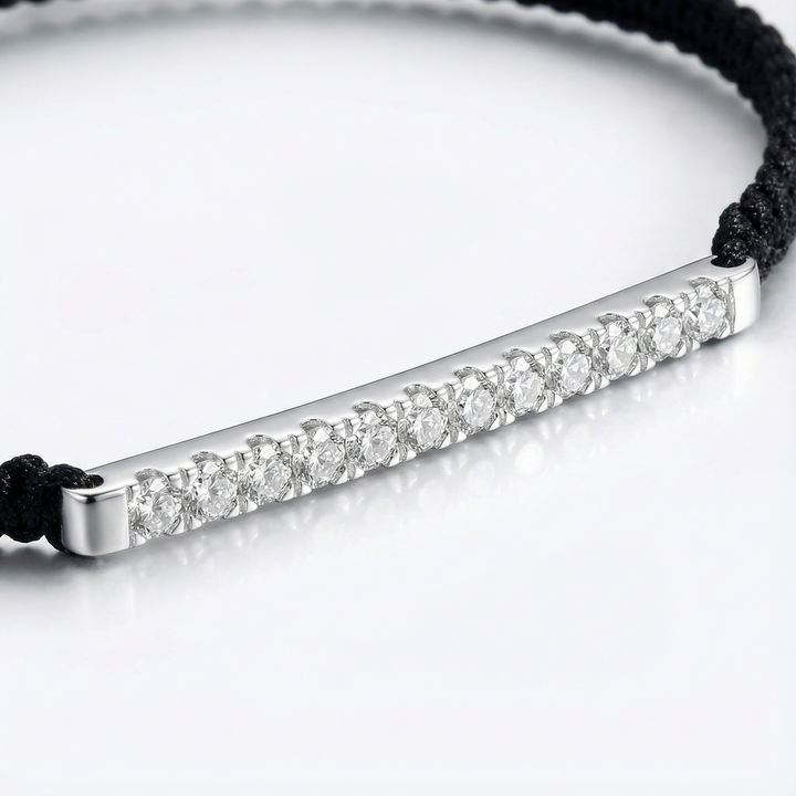 A sleek everyday bracelet that blends luxury with effortless style. The hand-woven black cord holds a refined bar of premium moissanite stones, creating a minimal yet radiant piece perfect for layering or wearing solo.