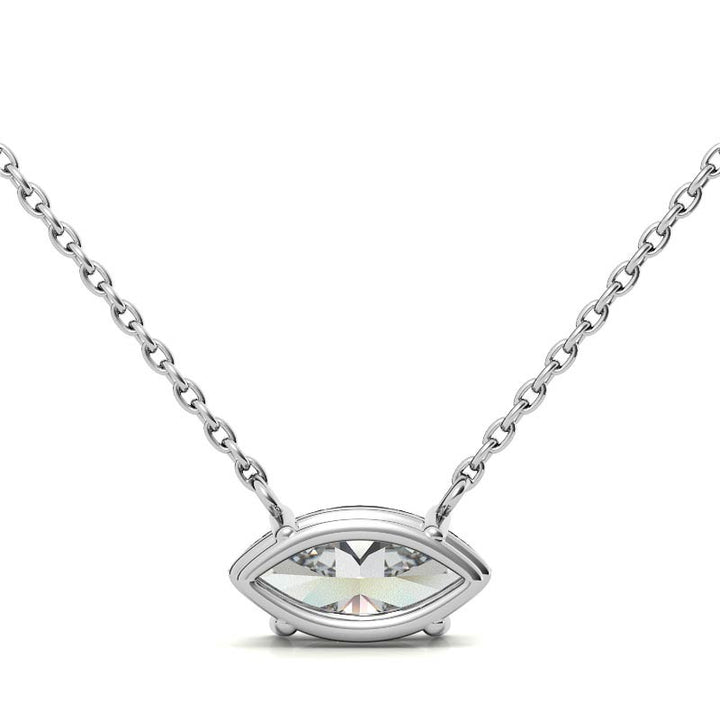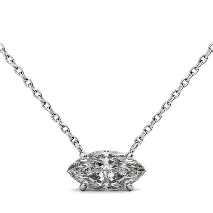 Material: Solid 925 Sterling Silver plated with 14K White Gold | Finish: Anti-Tarnish Coating | Stone: VVS Moissanite | Cut: Marquise (Horizontal) | Carat Options: 1ct / 2ct | Clarity: VVS | Includes: Matching chain